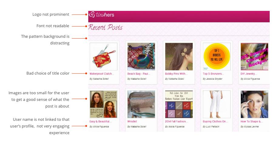 The initial Univhers solution was web based. The main problem was users were not posting new content and were not spending a lot of time on the website. The user feedback and analytics showed that most of the users were trying to use the website from a mobile device. The website was not responsive and not mobile friendly. Here are some of the screenshots of the old website highlighting the challenges. I had to design the Univhers App keeping in mind the existing features and the user pain points.
