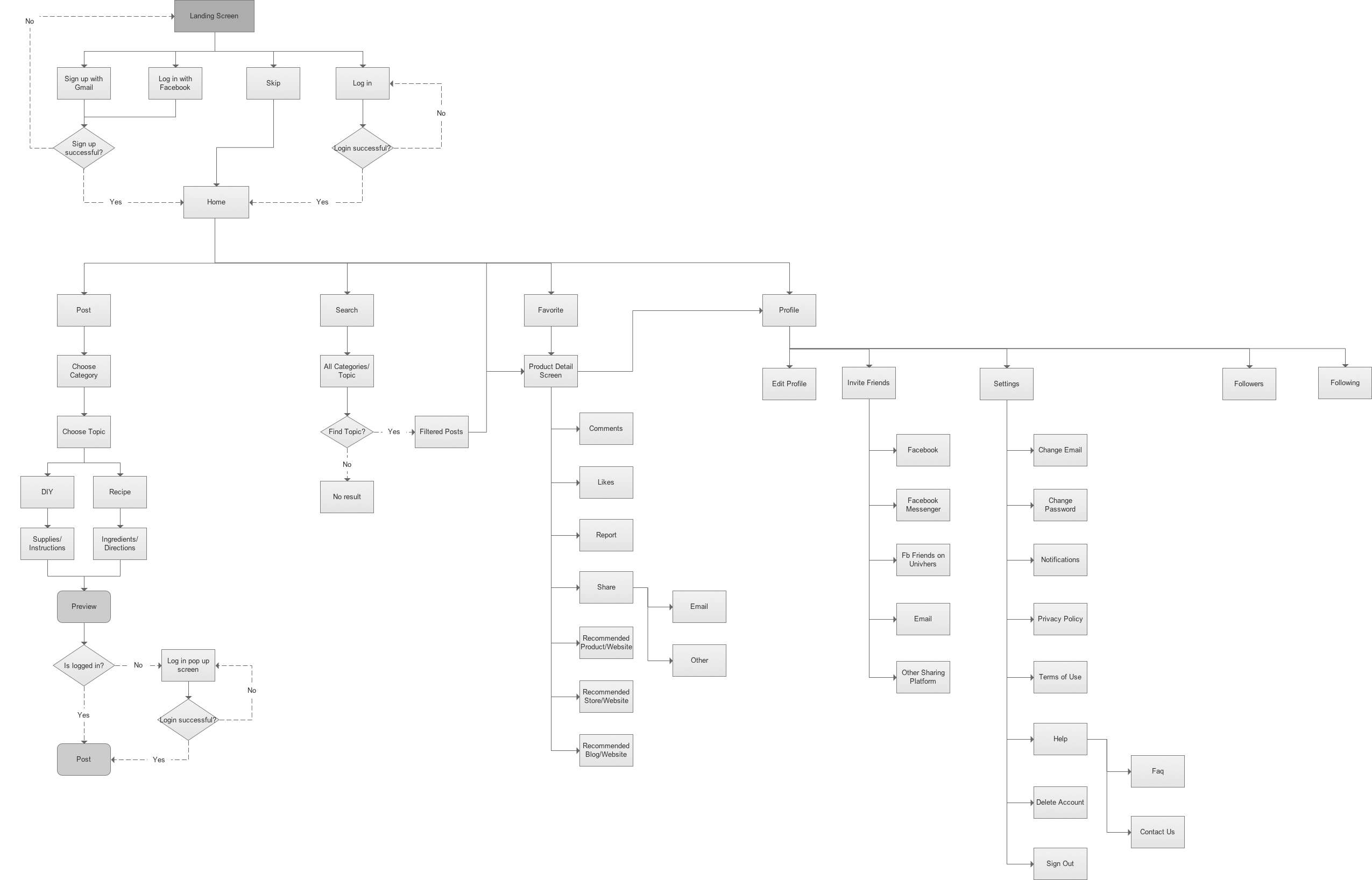 The process that I followed for this project was analyzing the existing Univhers website, competing solutions and user feedback. We had numerous sessions with entire team to brainstorm the features that we can keep and adding new features, which can enhance the user experience. Next step was to define navigation and for this we did card sorting with team and some friends. And then I created flow diagram, wireframes, prototypes and visual design for the App.